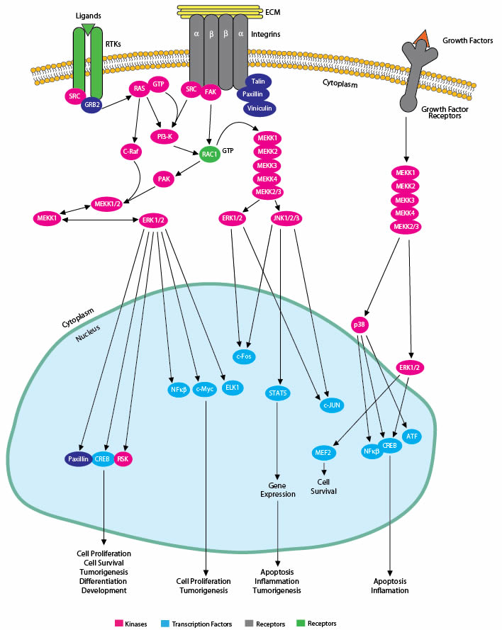 The MAPK/ERK pathway is involved in the regulation of a variety of growth and differentiation pathways through several phosphorylation cascades. The signaling cascade is activated by a number of receptors including RTKs, integrins and ion channels which then transduce the signal to adaptors which eventually activate Raf, MEK1/2 and ERK, the core components of the pathway. Erk regulates transcription factors c-Myc, c-Fos, and CREB via phosphorylation.