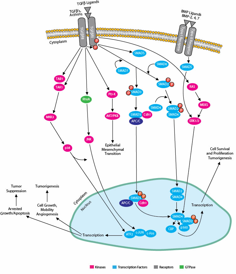 The TGF beta pathway is involved in the regulations of cellular proliferation, differentiation, embryogenesis and apoptosis. TGF beta binds its Receptor Type II which then phosphorylates the TGF beta Receptor Type I. The activated Receptor I can then phosphorylate various SMAD molecules which accumulate in the nucleus and act as transcription factors. The TGF beta is also involved in inflammation, immunity and cancer pathways.