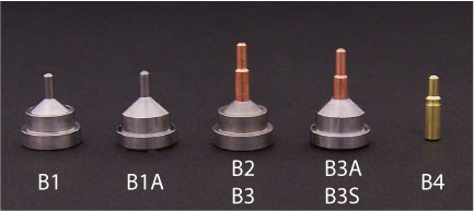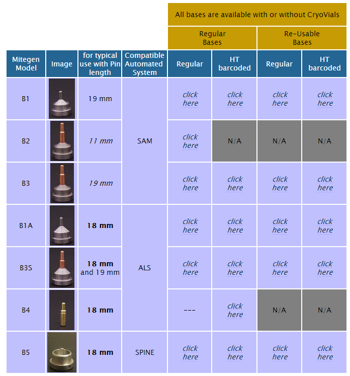 Base B1 has the flat "ledge" used by grippers in, e.g., SSRL’s Stanford Automounting System. Base B1Ahas the ledge-free conical shape used by grippers in ALS-style automounters. Use base B1A at LBNL's Berkeley Center for Structural Biology, with the PXRR automounter at Brookhaven lab's NSLS, at SER-CAT and at CHESS.