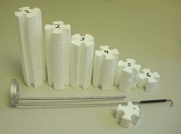 This set includes a uni-puck shipping cane, shipping spacers and clip. This set is for safe shipping of pucks to synchrotron sources and is compatible with most commercial dry shipping dewars. Up to 7 pucks may be shipped using this shipping cane. When less pucks are shipped, the corresponding Styrofoam spacers should be used to hold the pucks in place. The entire set which includes a puck shipping cane, Styrofoam spacers and Teflon clip is shown in the photo below.