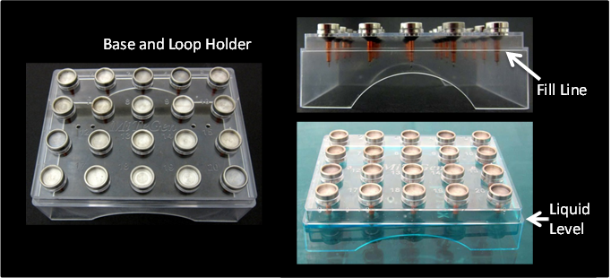 ![]() | •Load your loop-containing bases into the holder. •Then place the holder into a plastic or glass tub or dish. •Mix your detergent-containing solution according to the instructions on the detergent box. •Then pour the detergent into the tub until the level rises to the Fill Line on the base holder. This will ensure that the loop tips are soaked, while keeping the stainless steel part of the bases out of the solution and preventing corrosion. |